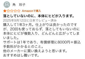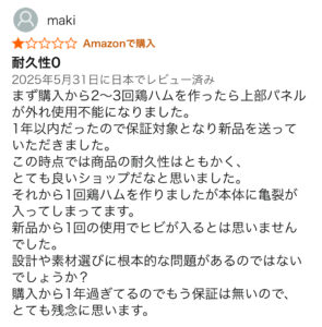 調理面や性能の不満ではなく、耐久性の問題があるようです😭