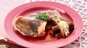 ③ 内なべに生姜・ごぼうを入れ、その上にかれいをのせ、煮汁を加え、本体にセットして、ふたを閉める。