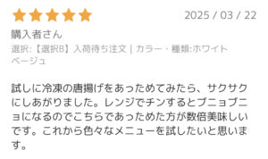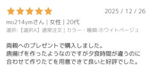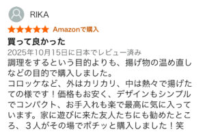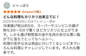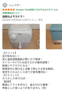 レビューにありましたが、「夕食時間が違うのに作り立てを用意できる」というのがノンフライヤーの大きな特徴だと思います