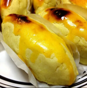 7.舟型のアルミホイルにバター適量を薄く塗り、⑤を形を整えながら盛り、溶いた卵黄と水を混ぜたものを表面に塗り、オーブントースターできれいな焼き色が付くまで焼き、仕上げにシナモン少々をふる。