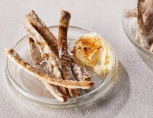 4.200度に予熱したエアーオーブンの[バスケット]にごぼうを並べ入れ、オイルスプレーでサラダ油を全体に吹きかけ、10分ほど加熱する。